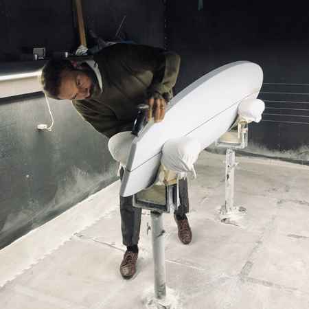 さらにオーダーいただいた時点で私が聞き取りさせていただいたいくつかの要素は、シェイプの前のミーティングでトリスタンに伝えられていますが、最初に紹介したように短めのサイズに対して幅はややプラスされているのがお分かりでしょう。